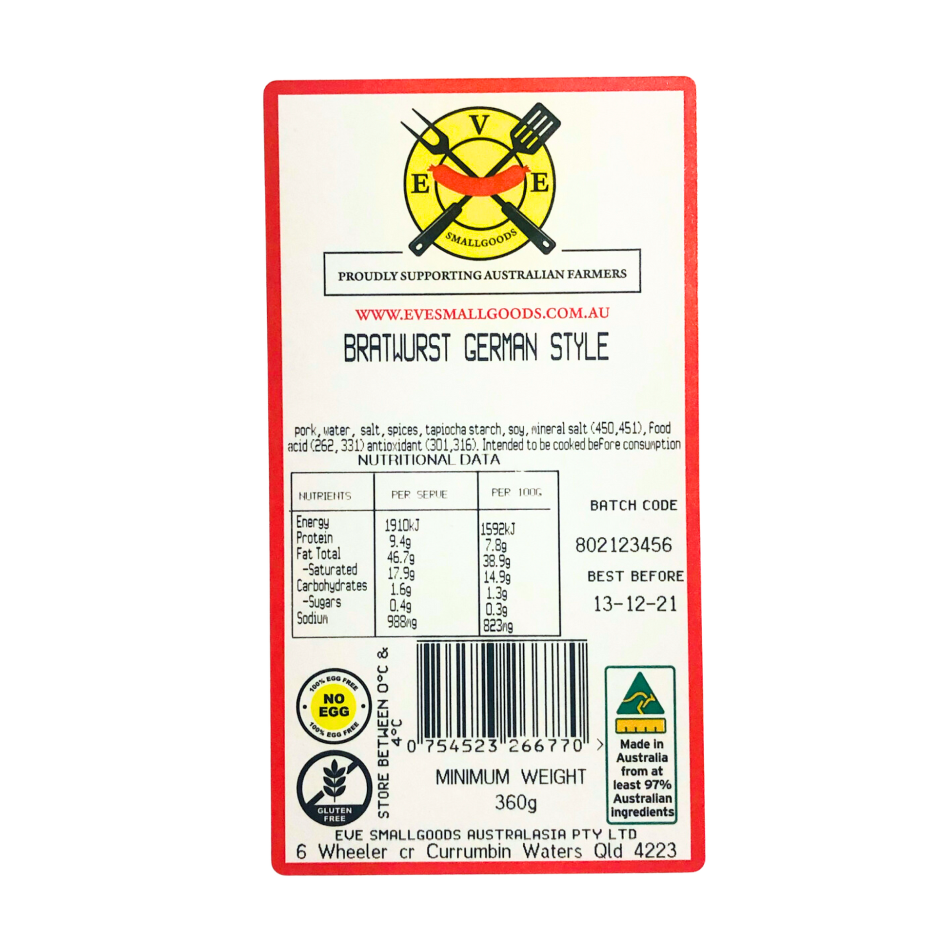 Eve Smallgoods products are made in Queensland by a small family owned & operated business. Our entire range is free from gluten, sulphite, dextrose, nuts, eggs, fillers and lactose (unless otherwise stated). Every one of our suppliers has been independently certified for their sustainable agricultural practices and animal welfare.