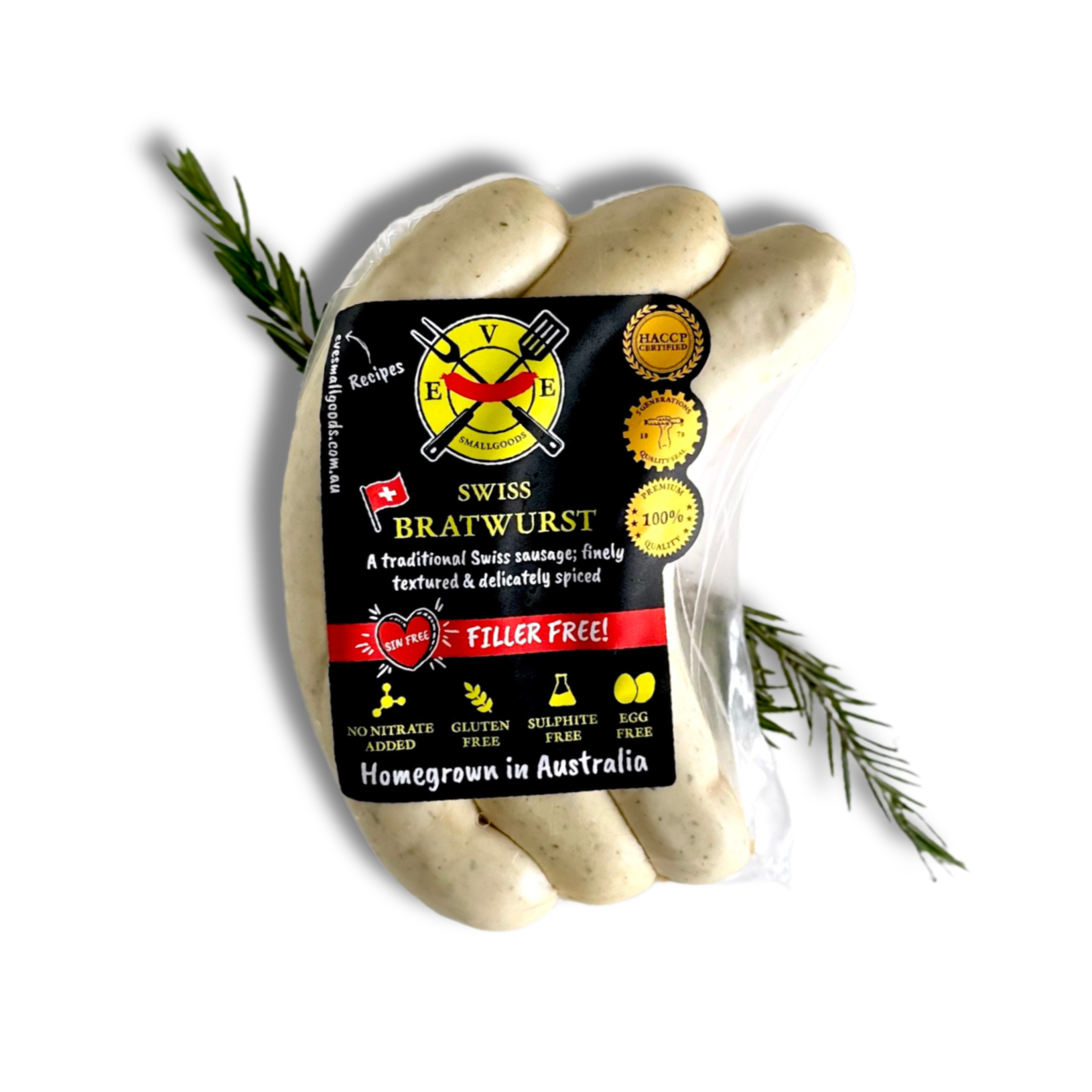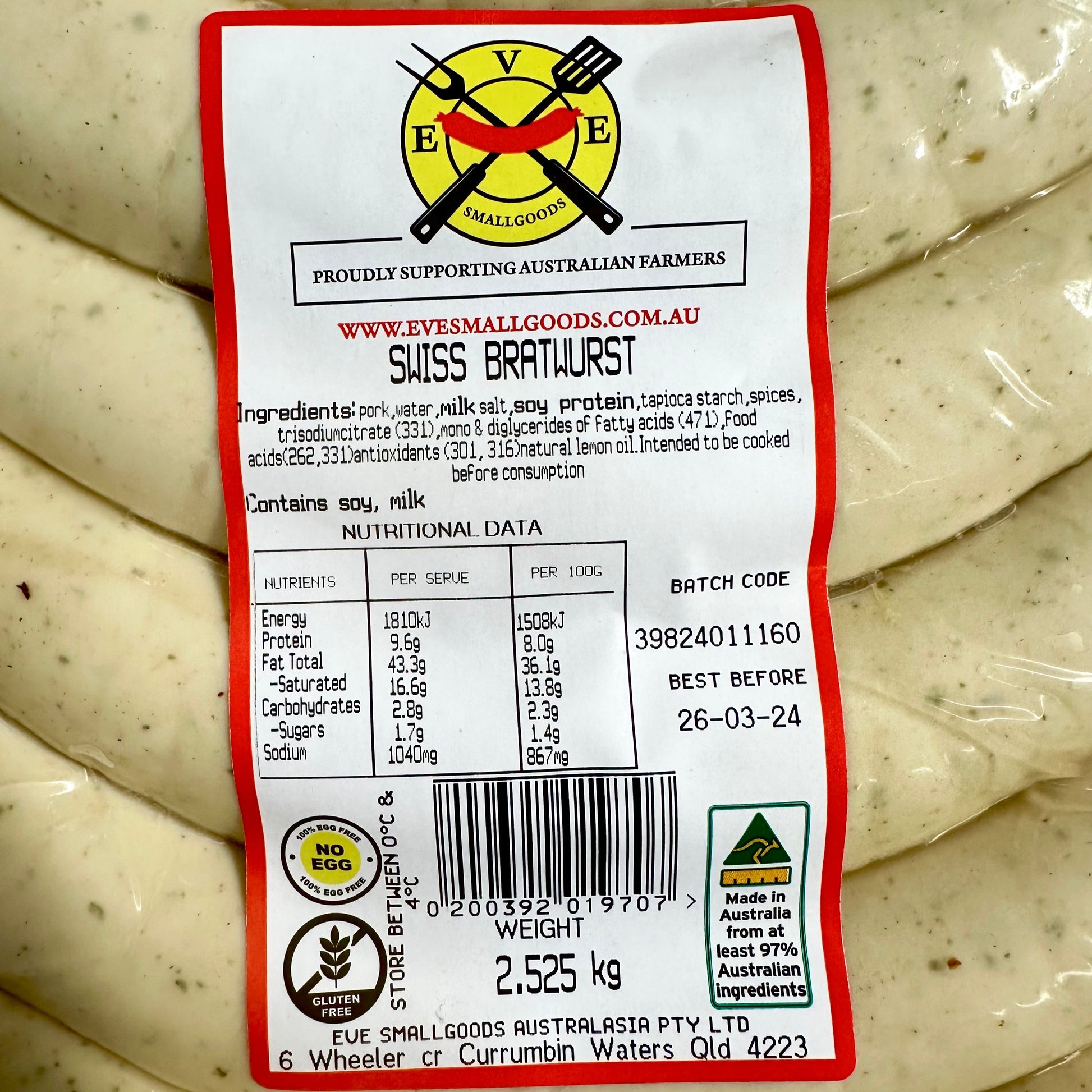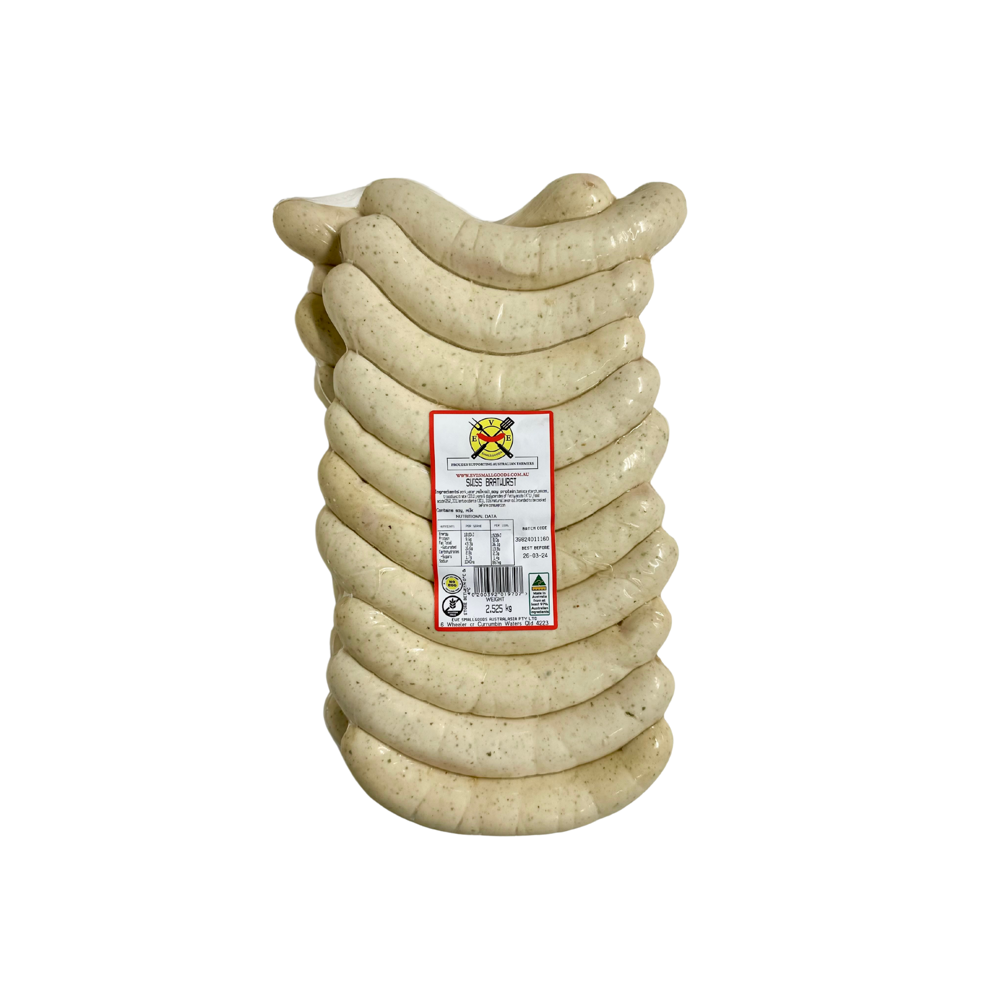 Eve Smallgoods Swiss Bratwurst is a culinary masterpiece, meticulously crafted with 100% Australian pork and delicately spiced to perfection. This traditional white pork sausage offers a fine texture and an exquisite taste that will elevate your dining experience. What sets our Swiss Bratwurst apart is the infusion of milk, which imparts a unique creaminess to each bite. We take the extra step of parboiling the sausages to ensure that the flavours are locked in, making every meal a memorable and savory delight. Whether you grill, roast, or incorporate it into your favourite recipes, Eve Smallgoods Swiss Bratwurst will undoubtedly become a gourmet staple in your kitchen, delivering a taste of tradition and quality in every bite.